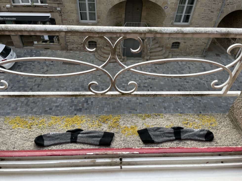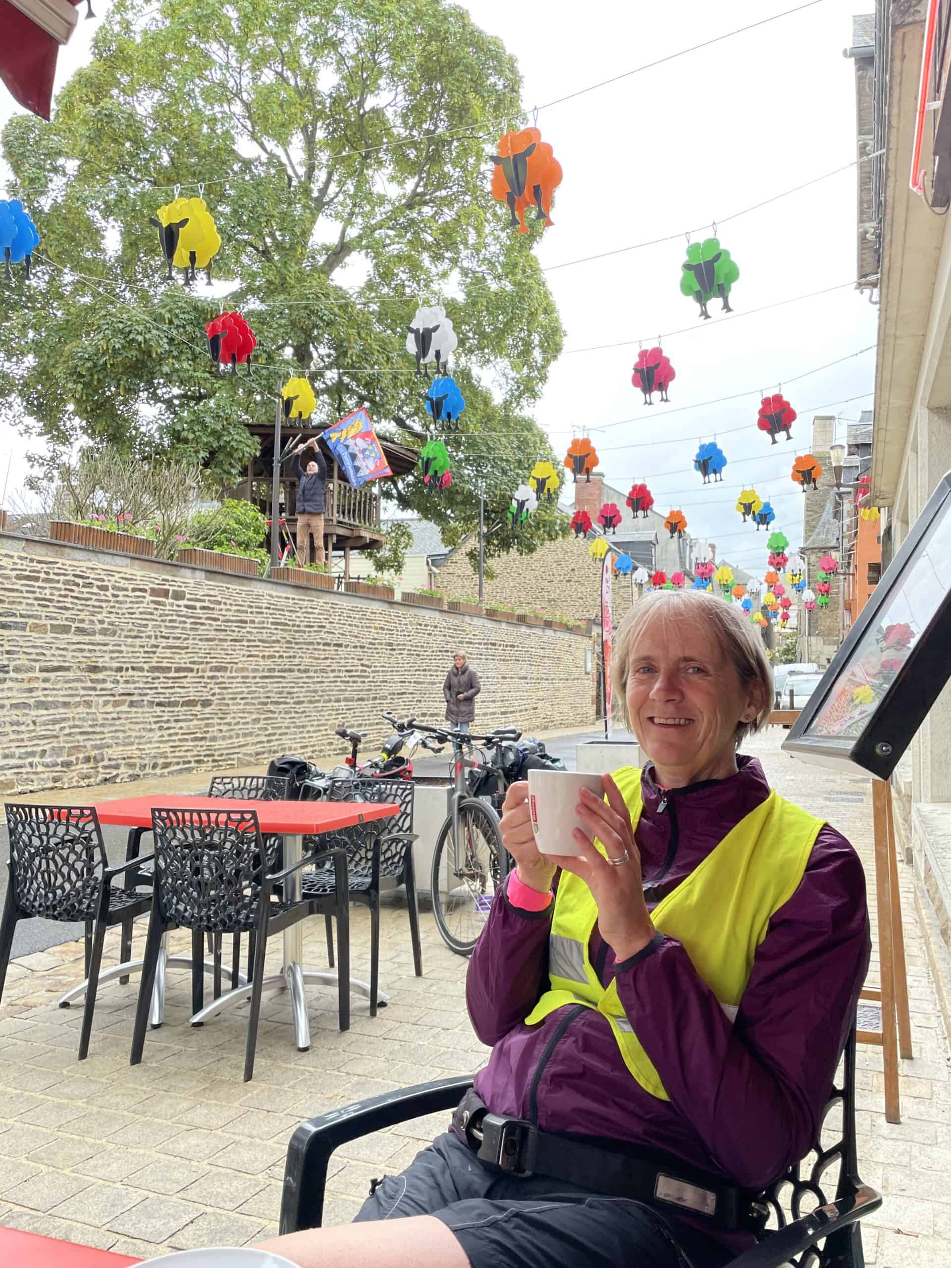 The tent and new mattress have proven their worth: super-comfortable! (except for the makeshift pillow). However Jackie had to use her pillow, aka her warm coat, as a warm coat, so had no pillow and was still cold! Woke at 6 to the sound of rain so dozed until it stopped around 8. Packed up and off to Pontorson just 3 miles away for breakfast. Pain au choc again! Put my saddle up a little as my right knee was really painful by the end of yesterday’s riding. Fingers firmly crossed that’s enough to sort it out, I don’t want knackered limbs this early in the trip!
