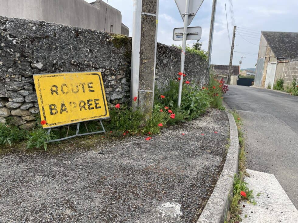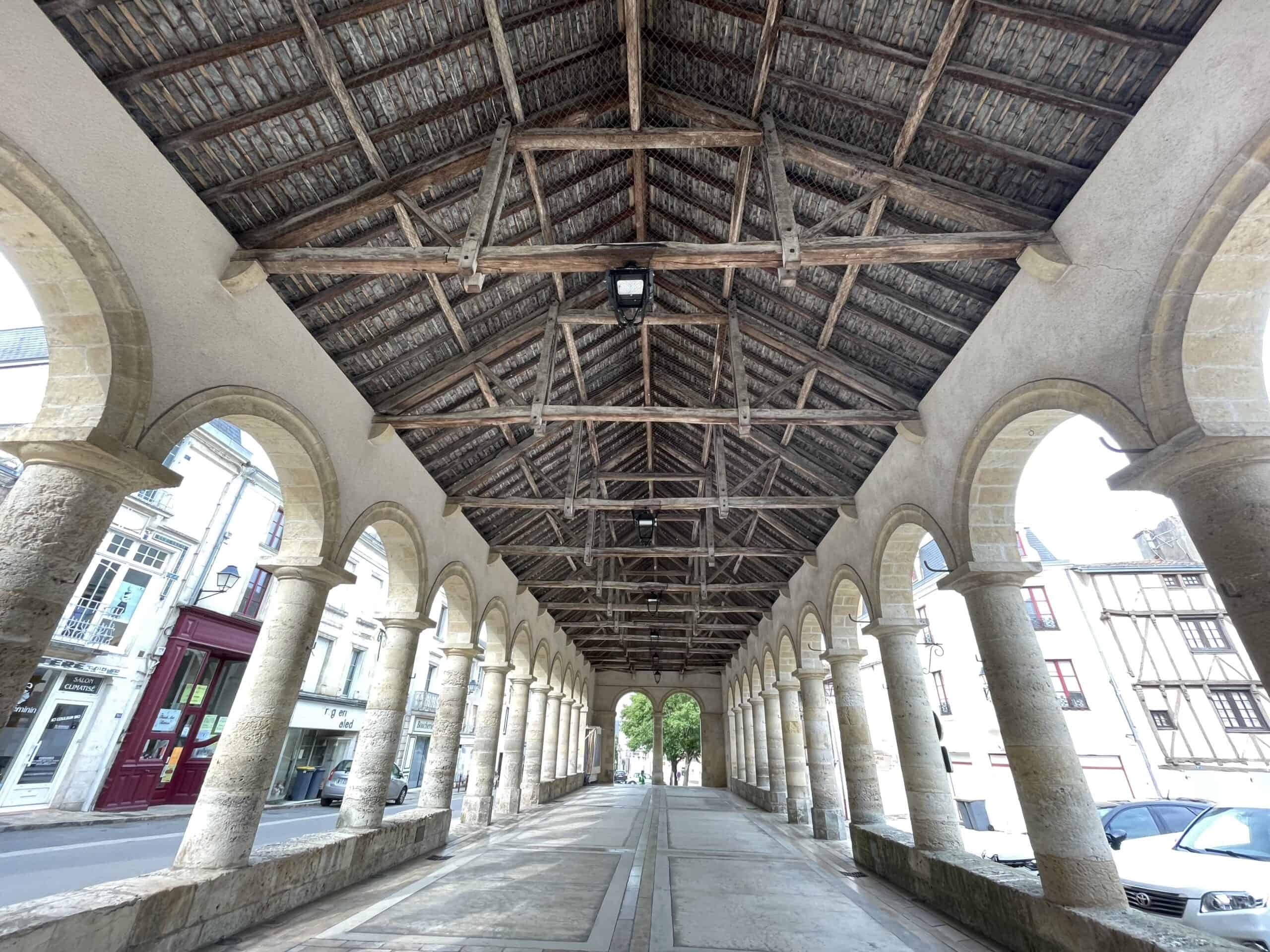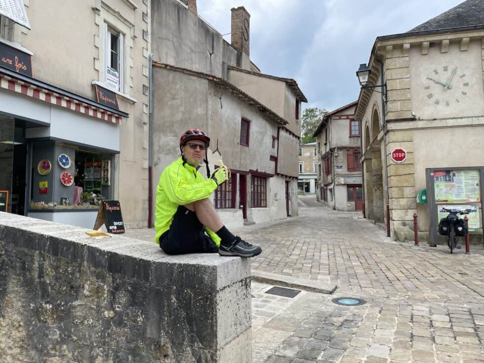 A quick breakfast of half a chocolate torsade each then packed up and headed into the nearby town of Airvault which was small and very old with an impressive half-timbered market hall. It was early-ish Sunday morning so there wasn’t much going on. A small epicerie provided us with a banana each to supplement our breakfast. Fuelled up we headed out of town to start the day’s ride.