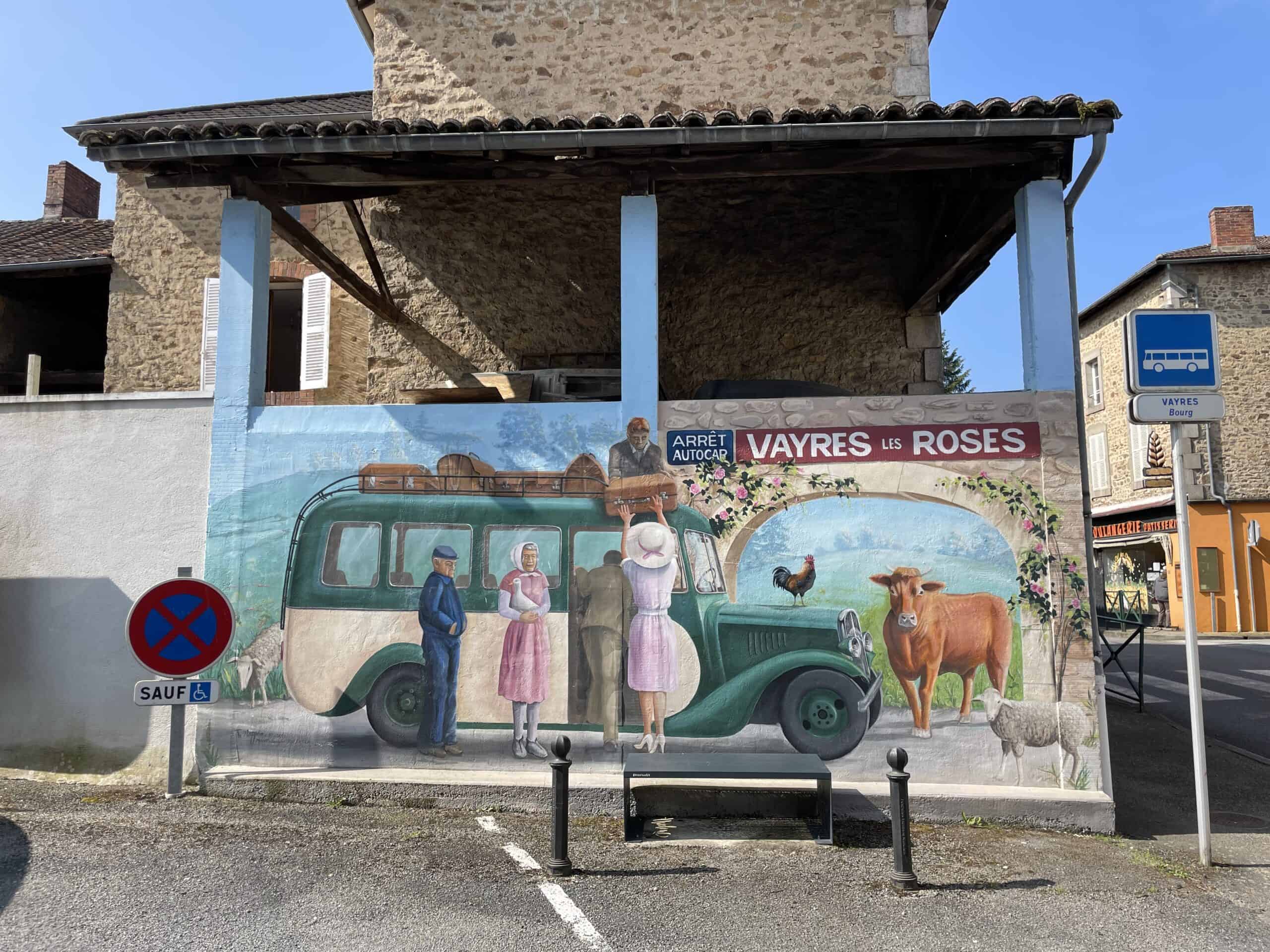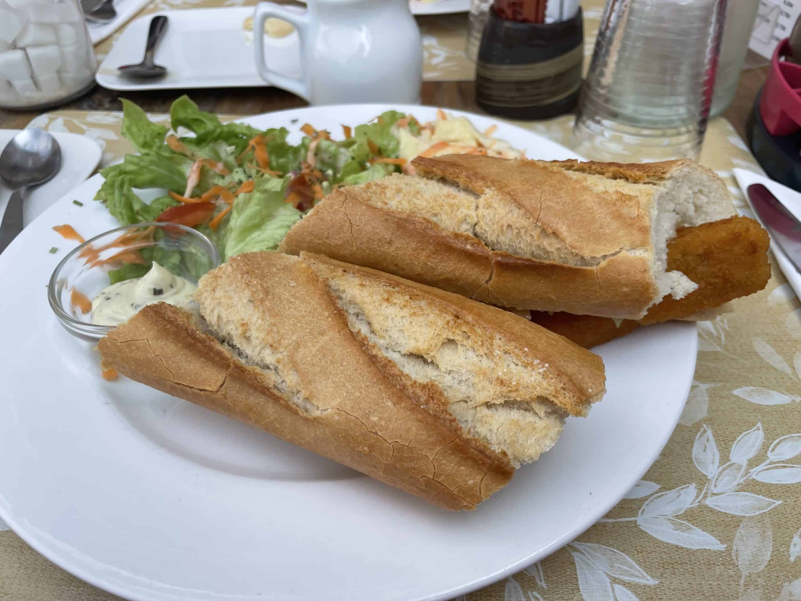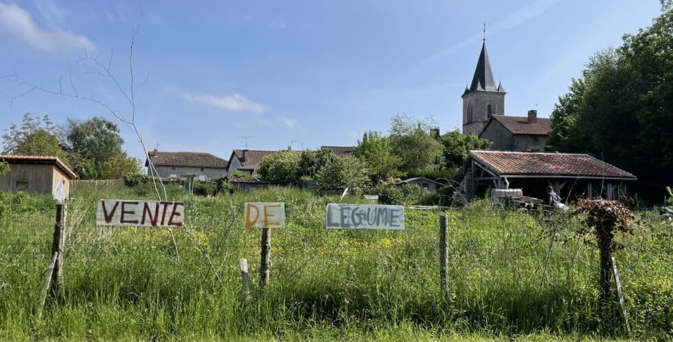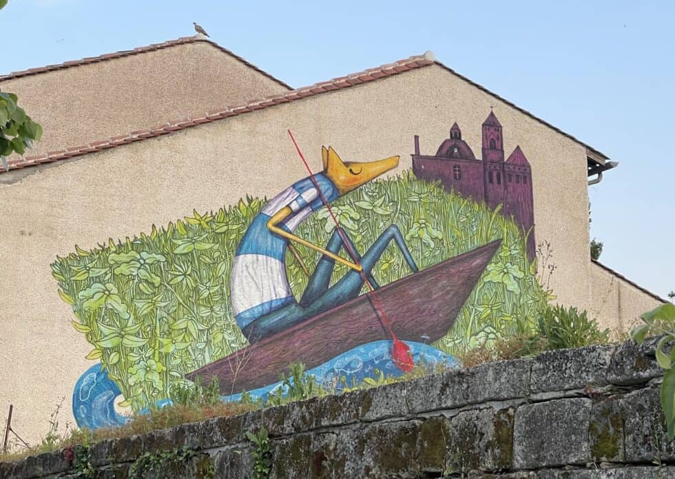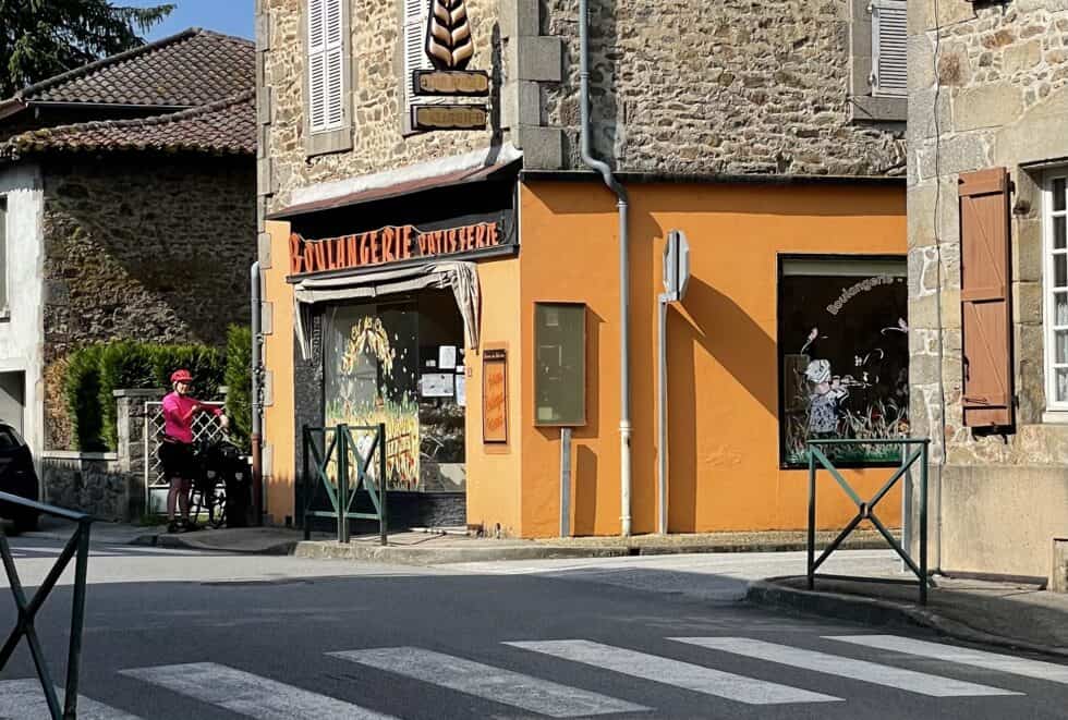 Stopped in a village beginning with V for croissants. Rode on for a while and then in Saint Matthieu we discovered a lovely café run by an English couple where we had a large early lunch of fish-finger baguettes. Hadn’t expected that in France! As we left an elderly man came out of his house calling after us. He gave Jackie a cycling magazine which he said was a gift. How lovely!