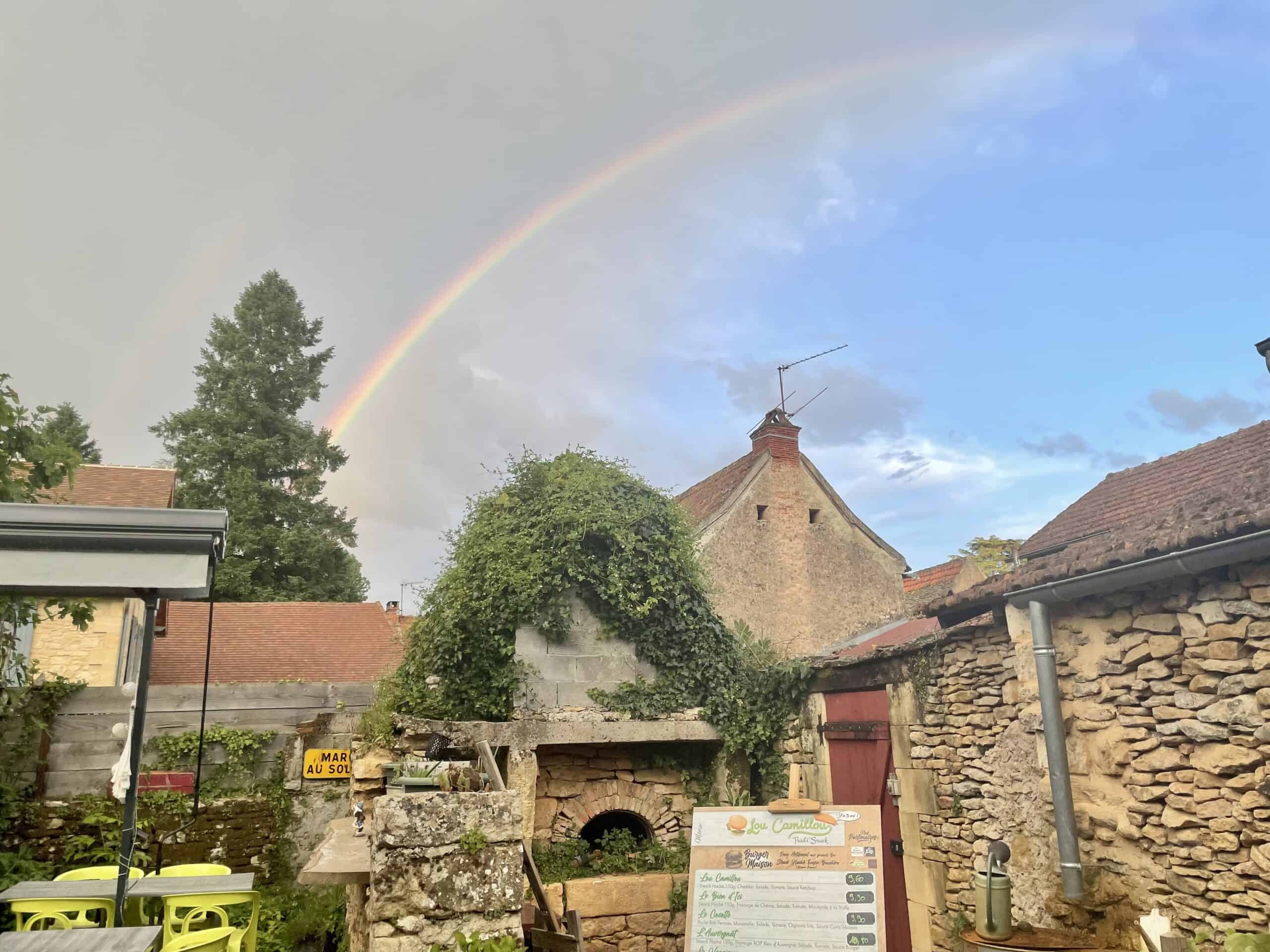 Explored the village on foot. Had free-range chicken burgers with curry sauce, chips, green salad and a nice little rosé. Finished eating and rain started. There was a beautiful rainbow behind the brasserie. Un arc en ciel.