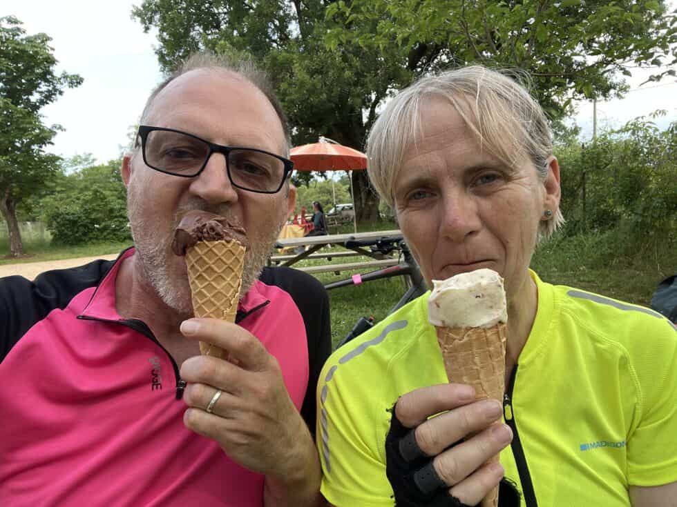 Decided we would cycle a bit after all. Set off for a short 10 mile jaunt in the cool of early evening. After just 2 miles we passed a field of goats. Next door to that the goat owners had built a lovely ice-cream parlour to sell their goat-milk ice cream. It would have been rude not to.