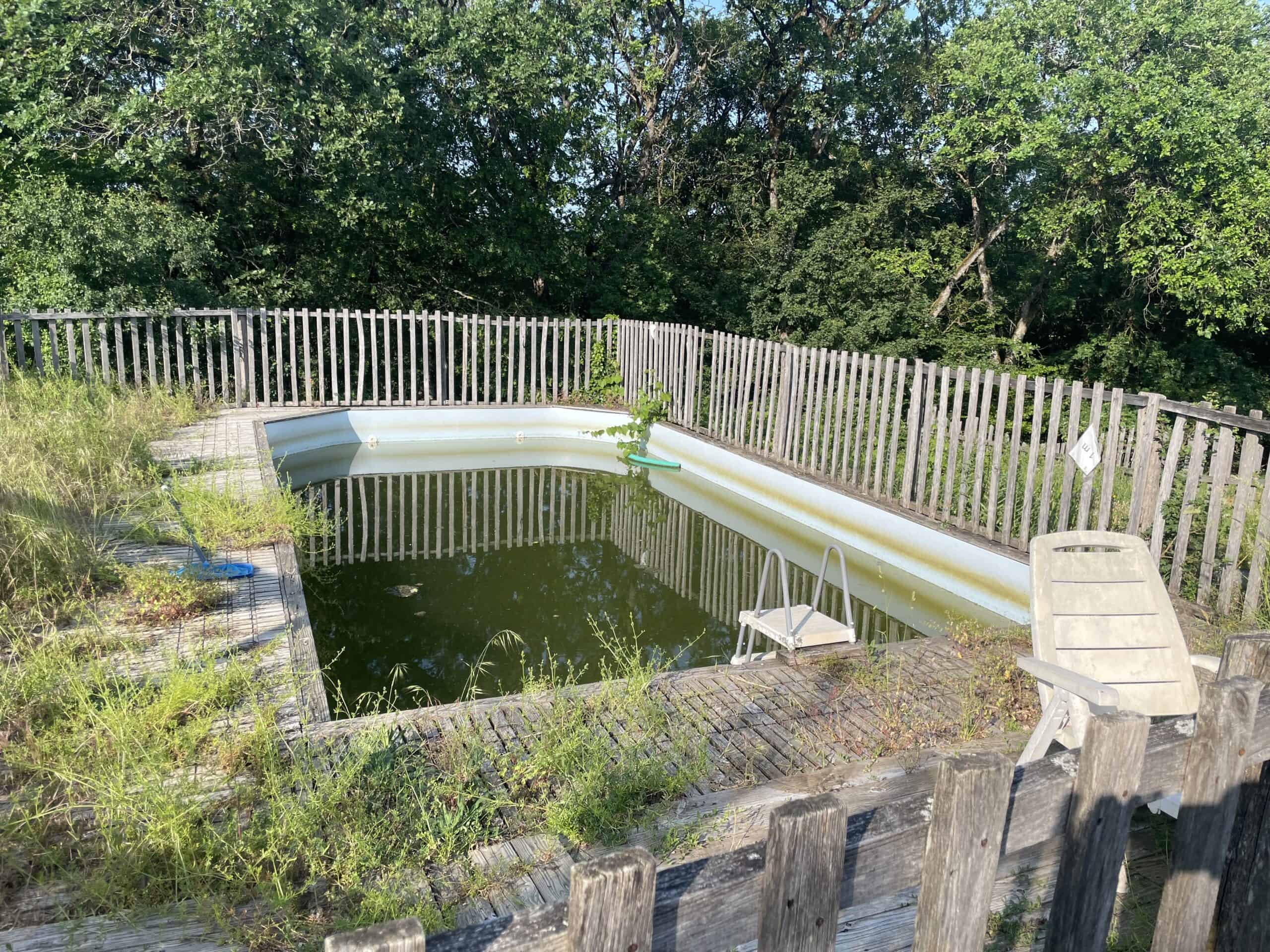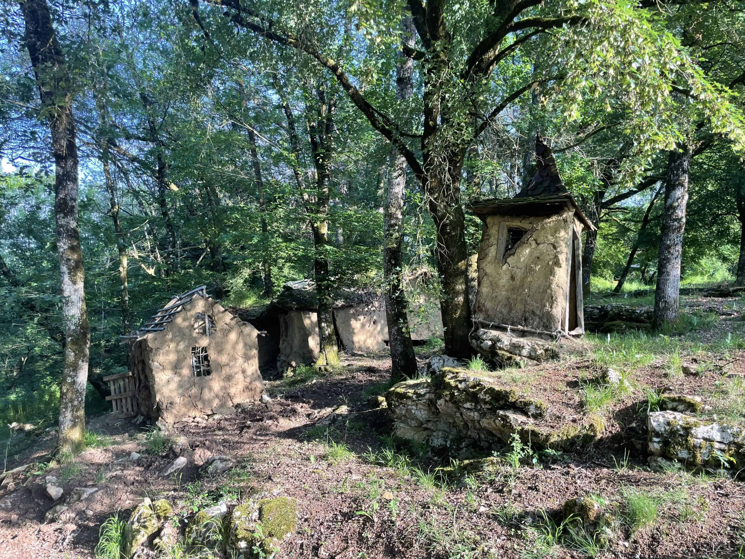 On one side of the field was a little woodland which contained several home made miniature buildings fashioned from something akin to adobe or perhaps straw bales covered with mud. They were ramshackle to say the least. We think they were practice structures as there was a full-size building of similar style, but slightly better made, housing a washing machine, some sinks and three showers. Everything was quite grubby. Round the back a single compost loo. The swimming pool was green. I mean the water, not the decor.