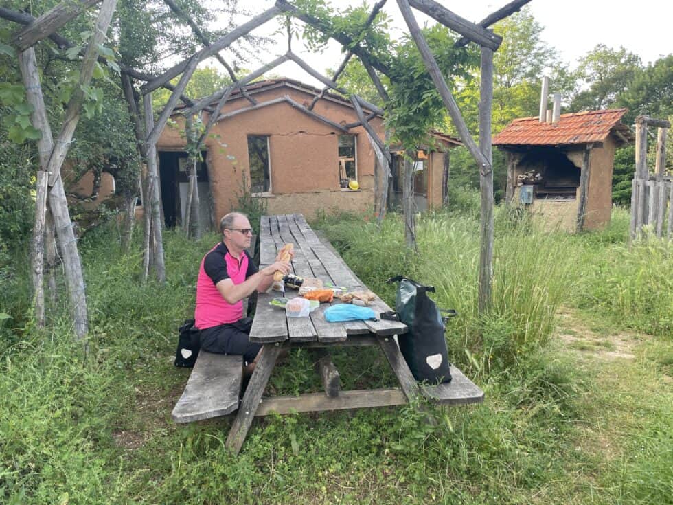 Our campsite for the night was on an organic farm. It was not much like a campsite and quite a lot like a scrappy unkempt field with an enormous density of stones of various sizes in the soil. There was just one man there staying in a caravan with his dog.