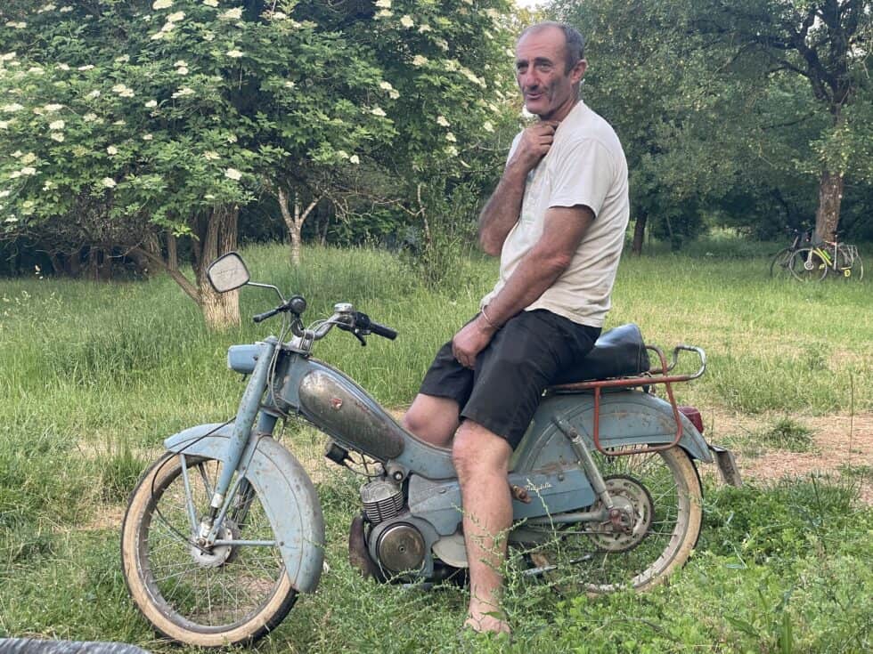 We put the tent up and then enjoyed a a picnic dinner during which host Patrice arrived for a chat on his absolutely lovely 1963 Mobylette moped. He said it never broke down and was his favourite piece of farm equipment. As he left he stood up to pedal hard and then the engine kicked in and with a cloud of blue smoke he zoomed off across the rough field.