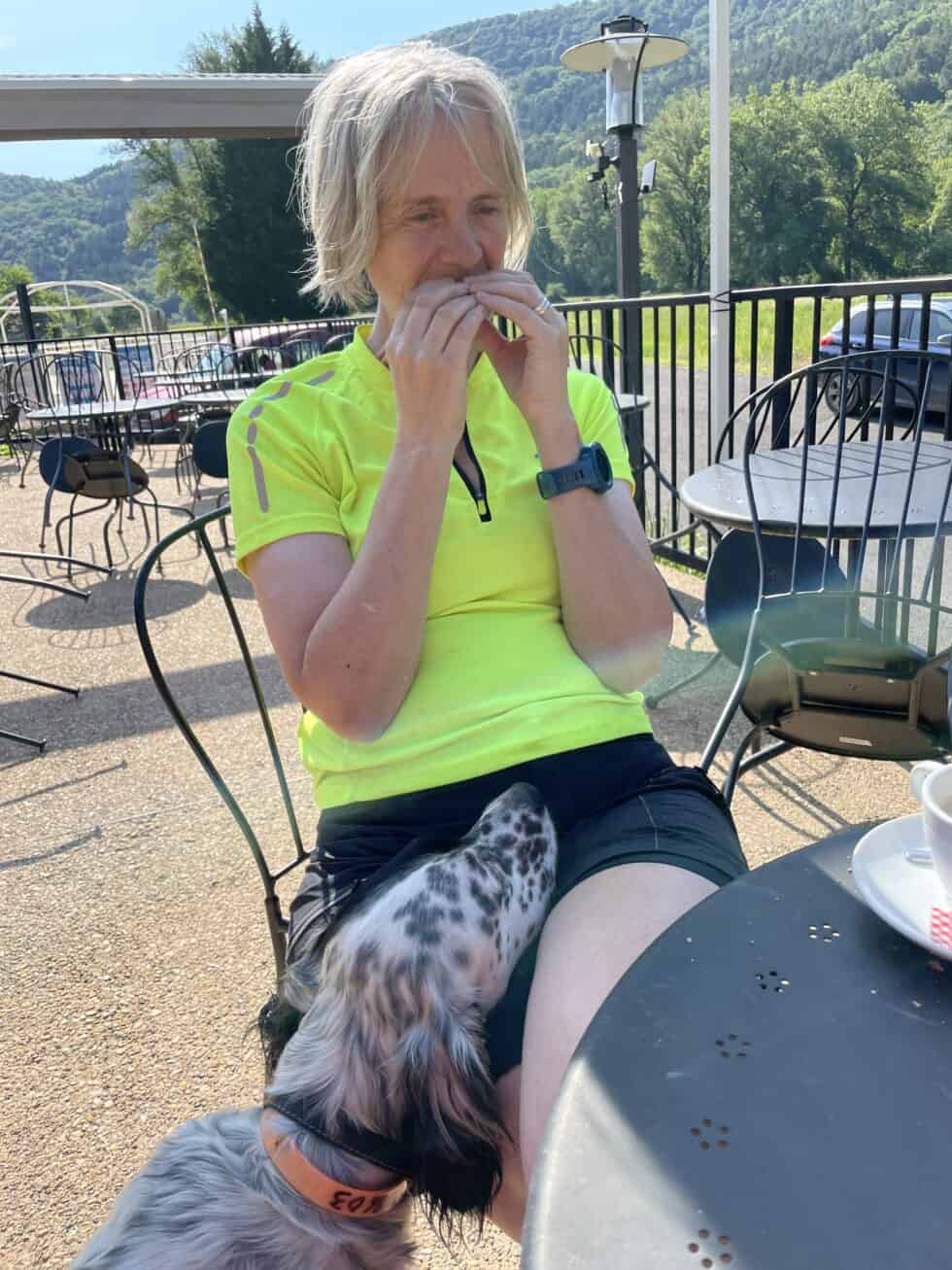 Breakfast on the campsite, bread & cheese followed by pain au choc with coffee for Jax and a lumpy hot choc for me. The lovely campsite dog came to see us. I like dogs. Jackie is very wary of them and not welcoming. So who did he want attention from? That’s right, not me.