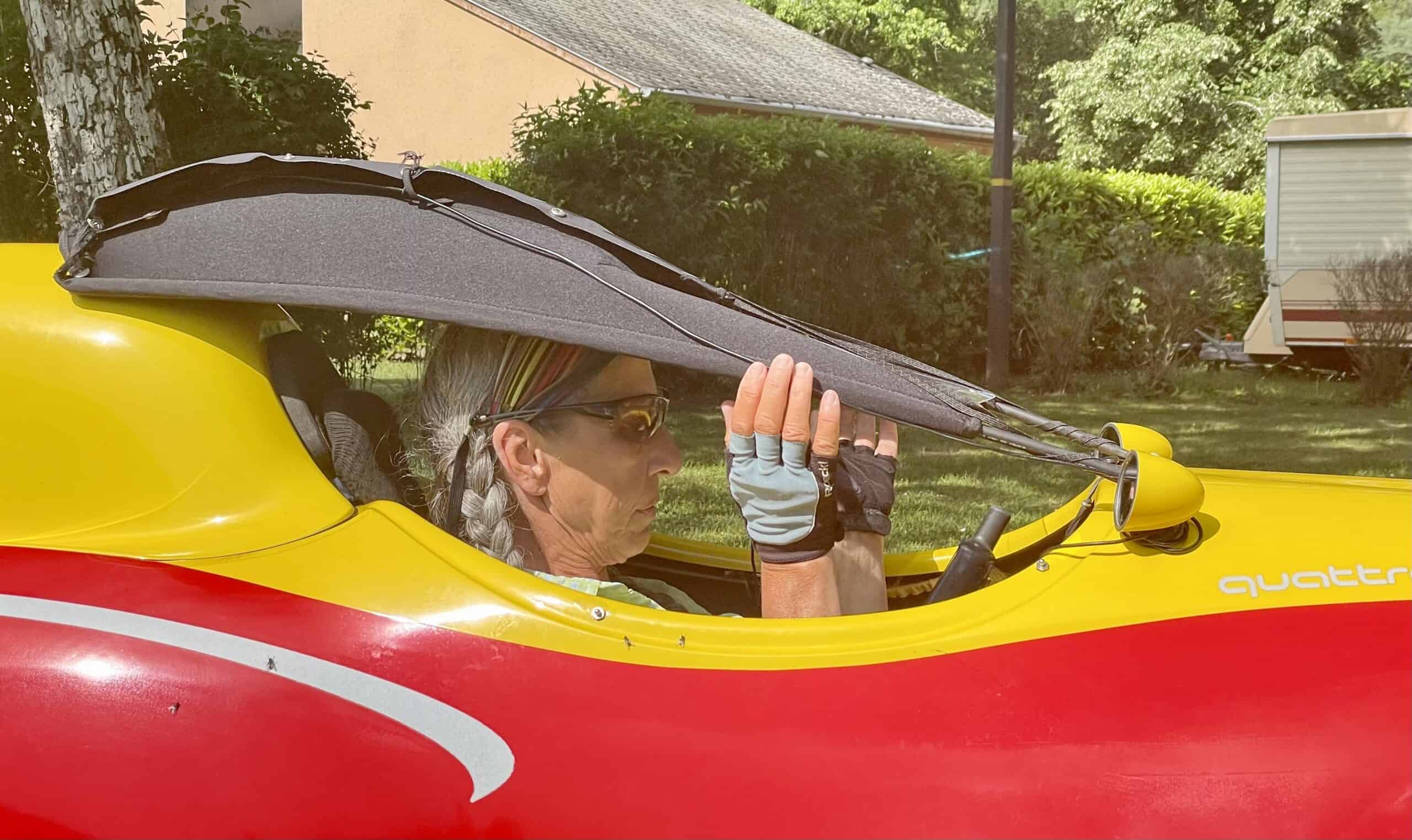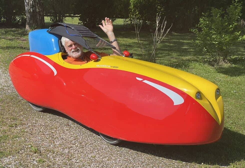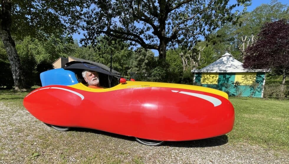 Met Wolfgang Ritter and his wife. I didn’t get her name as Wolfgang was the dominant character and was only too keen to show off their bikes. They were four-wheeled recumbent bikes from Holland. Each had a full fibreglass body in bright red and yellow complete with wing mirrors, headlights and tail lights. A roof hinged over the cockpit and was covered with solar panels that powered the lights and intercom system as well as recharging their phones and power packs.