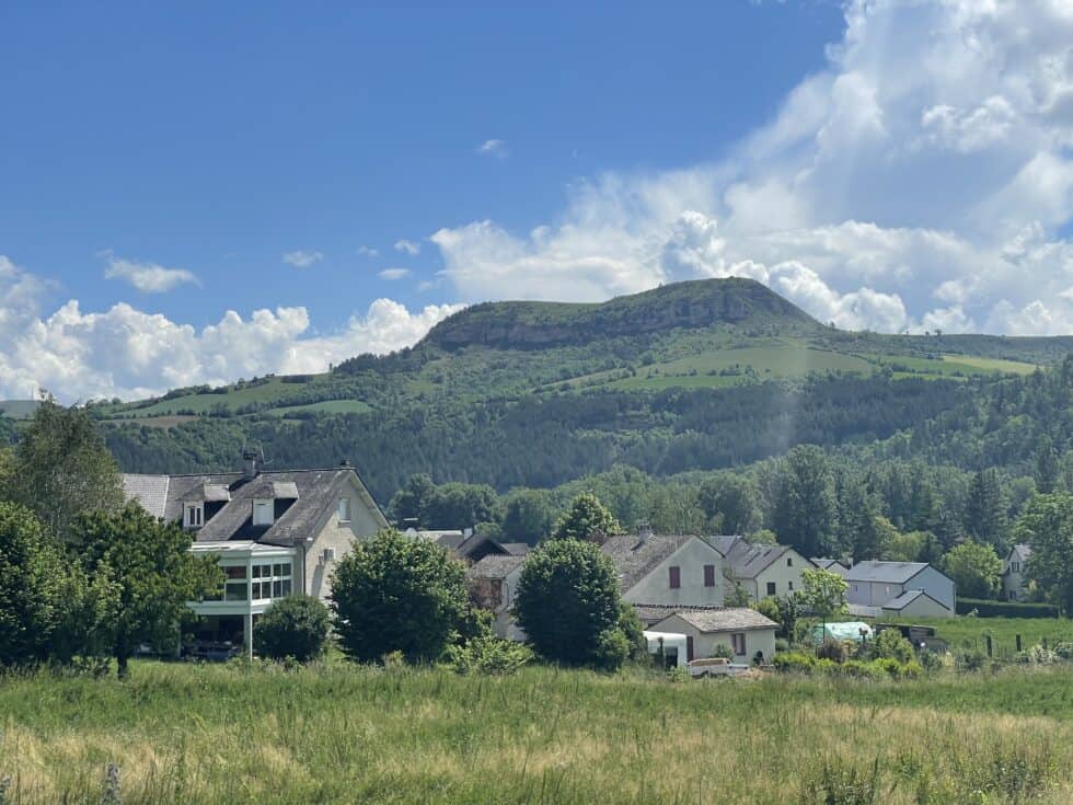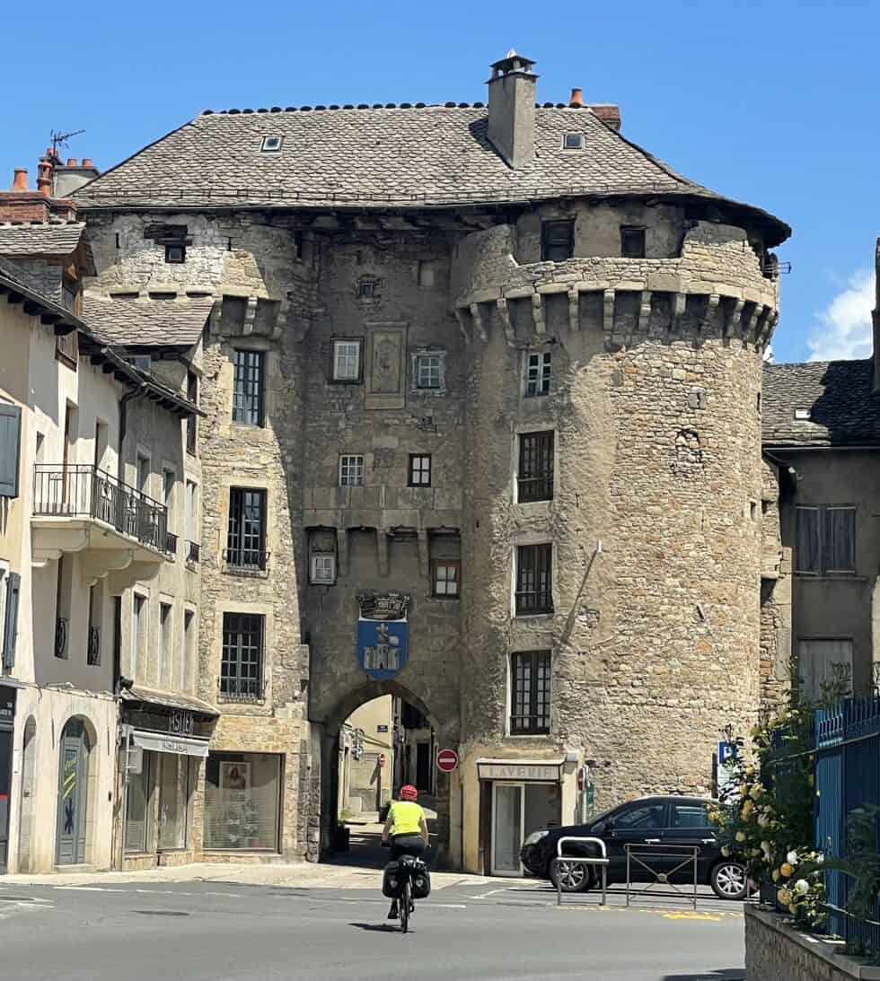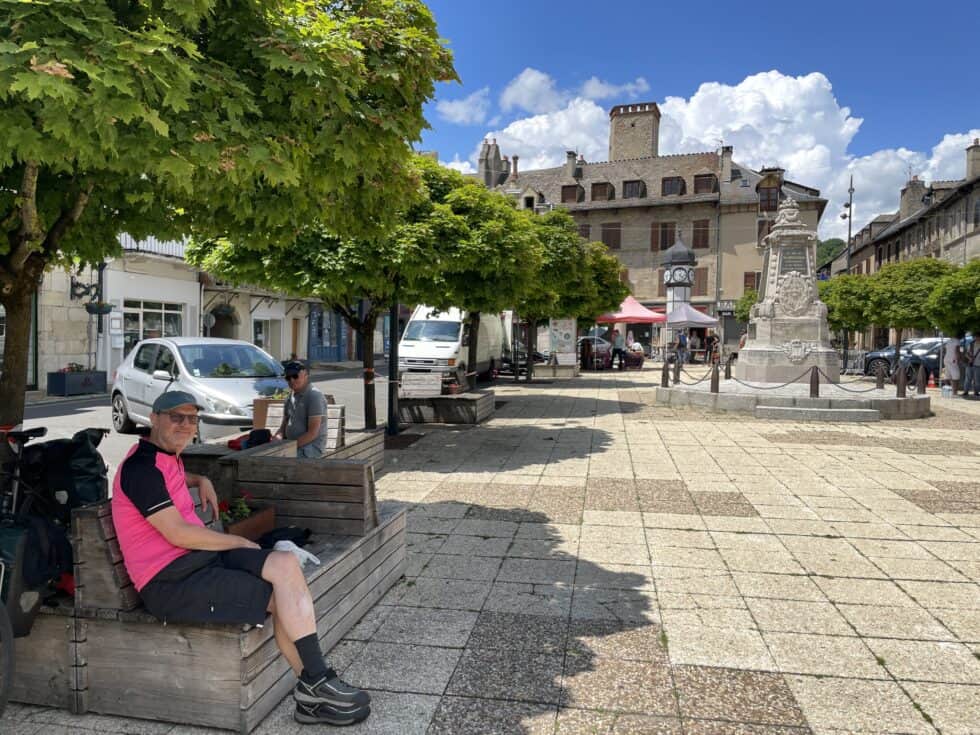 Long gentle upward incline 16 miles to Marvejols where we ate our picnic lunch in the town square and then had a drink outside a small bar by a busy roundabout.
