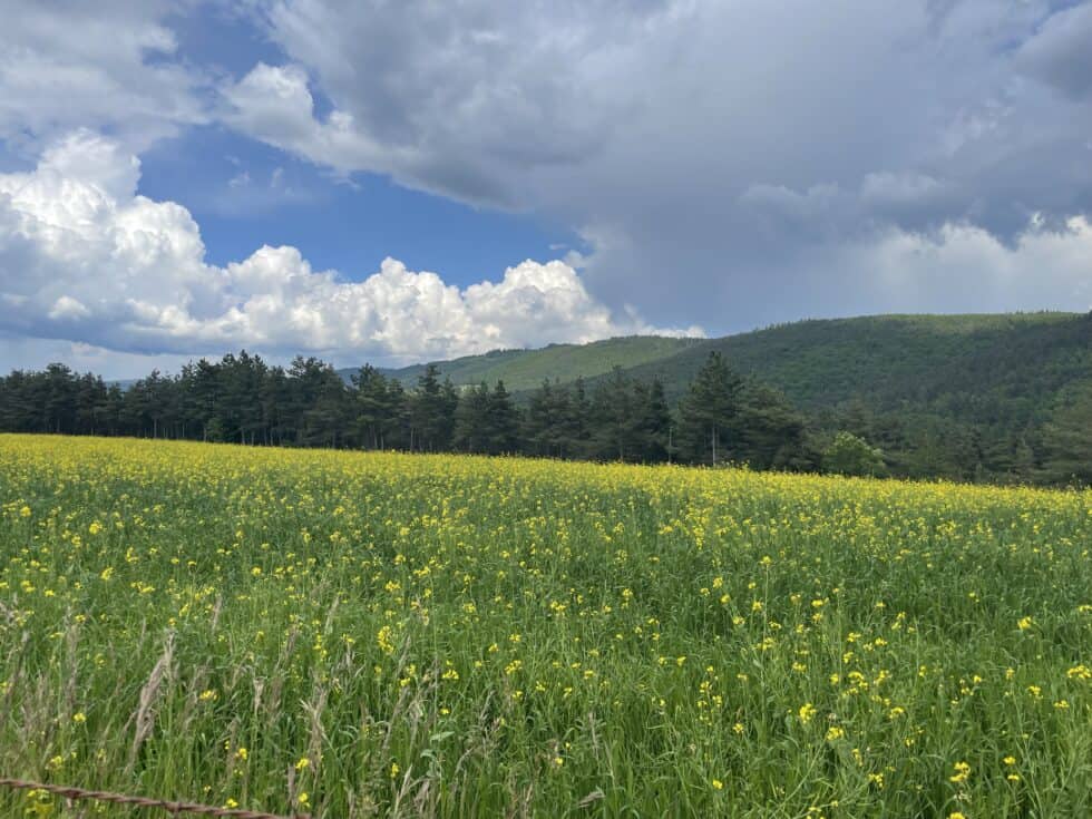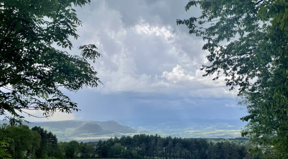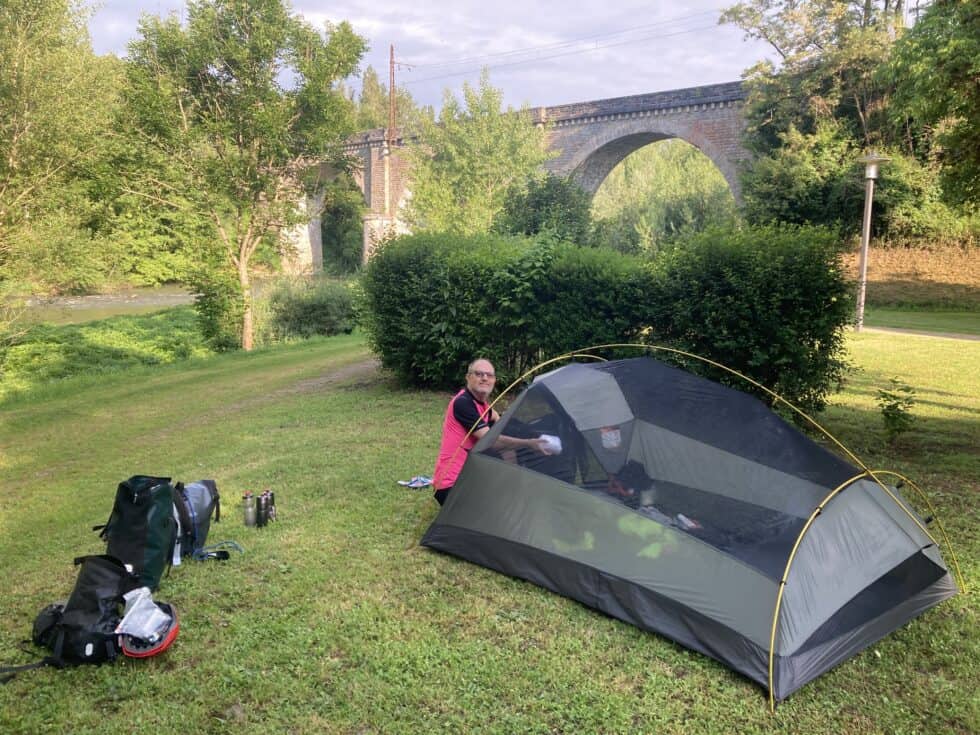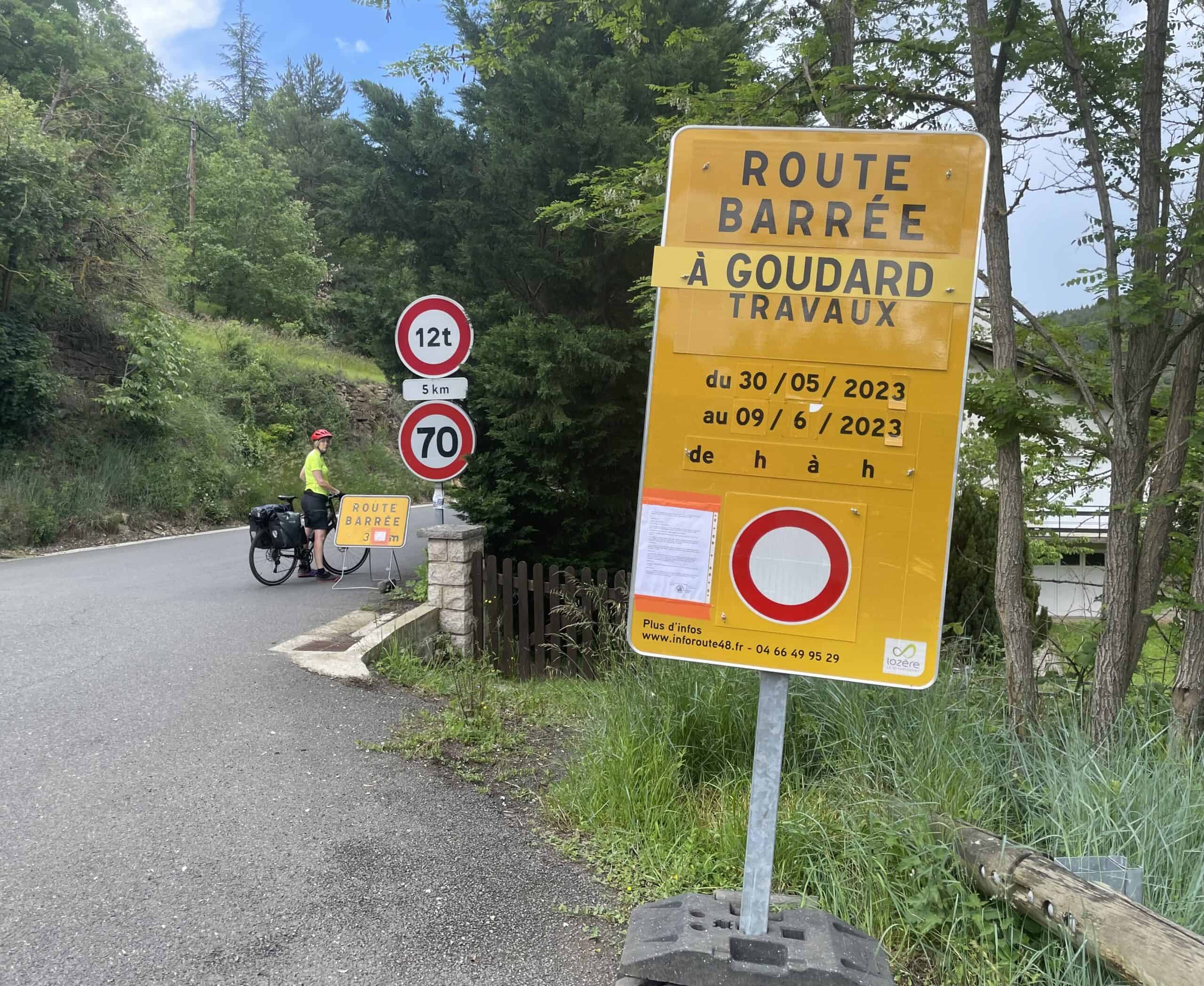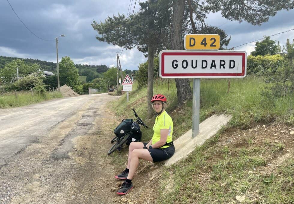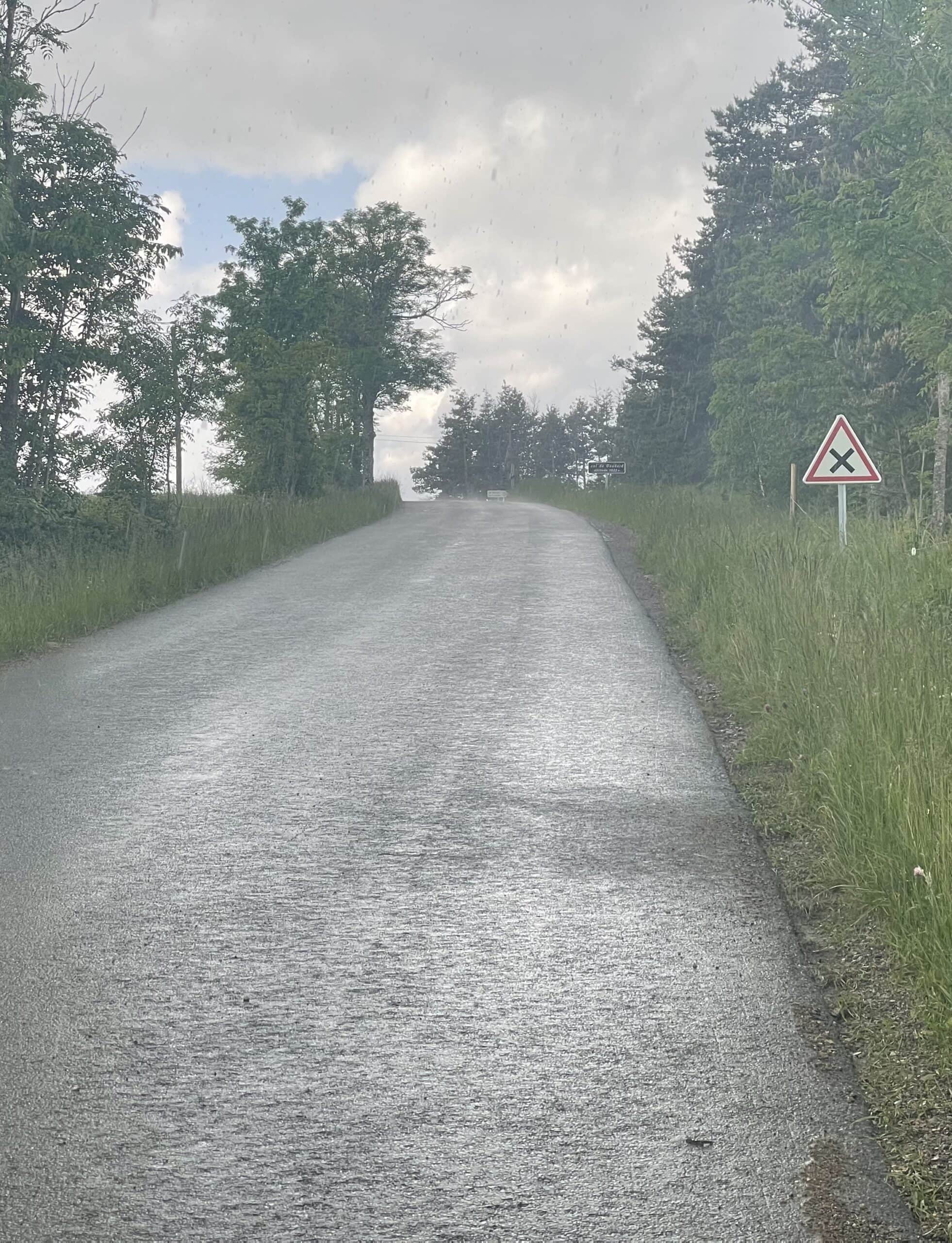 Heavy rain just before the summit which turned to hail for a while. We got progressively more soaked during the fast descent then arrived at a decision point: Turn right to go to our planned campsite 1 mile away or turn left and cycle 6 miles to Mende and get slightly ahead of ourselves, making tomorrow’s route easier. I chose Mende. We were already soaked so a little more riding wouldn’t make any difference. Ha! It bloody did. Up another really long steep hill and the rain just got heavier as we went.