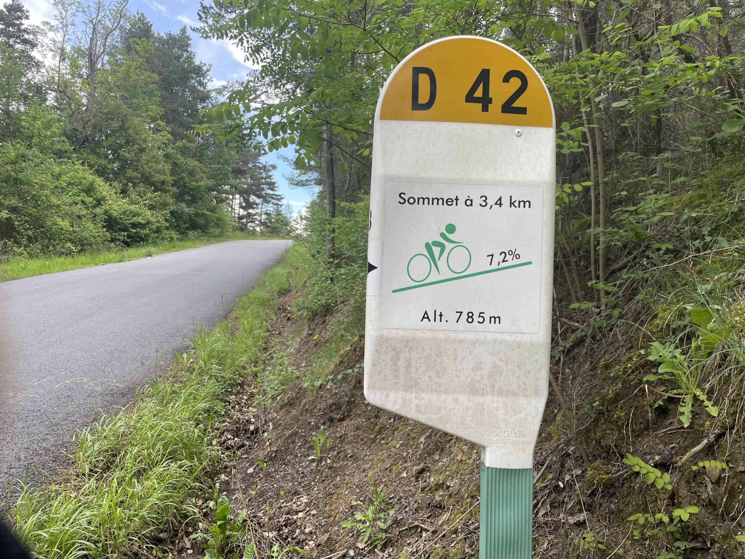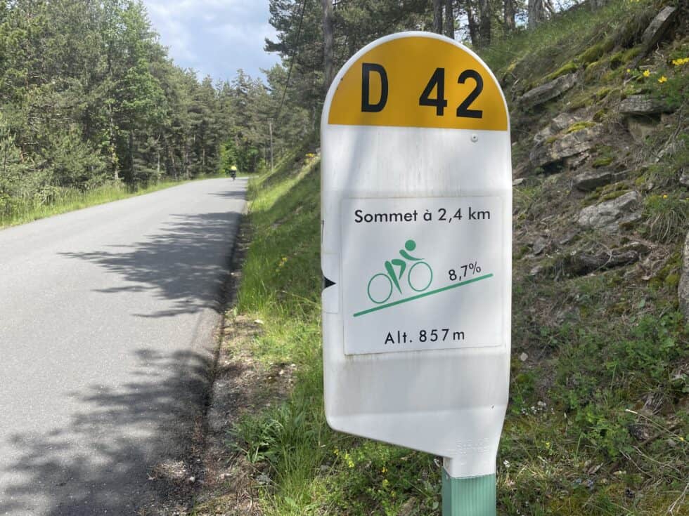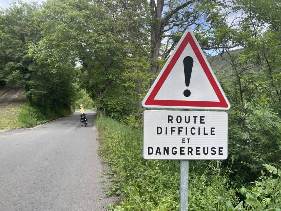 Onwards to the huge climb. Massive, steep and very difficult. Our pace was super-slow and at times we had to walk. There were messages for cyclists painted on the road and cycle-specific signs along the way, making us think it’s a well known biking challenge. A French cyclist appeared at one point, a super-fit guy in all the kit riding a very sporty looking road bike. He put his hand on my back and pushed me a little way up the hill, laughing.