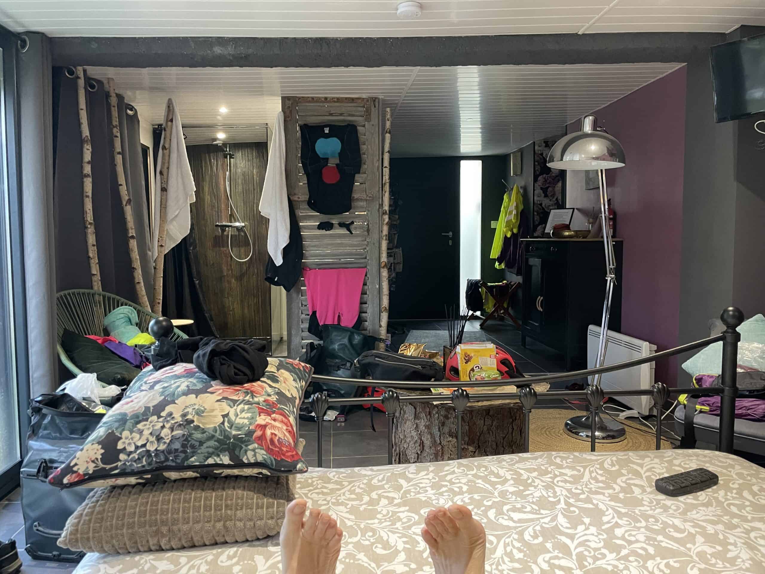 Still soaked to the skin we searched online for a hotel. Found one that looked suitable and cycled to it, not far from the centre. Couldn’t find it though. It turned out we were right outside but hadn’t realised it was a chambre d’hôte rather than a hotel. Luckily the owner was outside and we asked him for directions. How serendipitous as at this moment the rain started again with a vengeance. We parked our bikes in the garage and he and his wife showed us to the room. It was fun and looked into the garden. Most importantly it had a heater, a hot shower and clean towels. What a relief! We’d been cold and wet for far too long today.