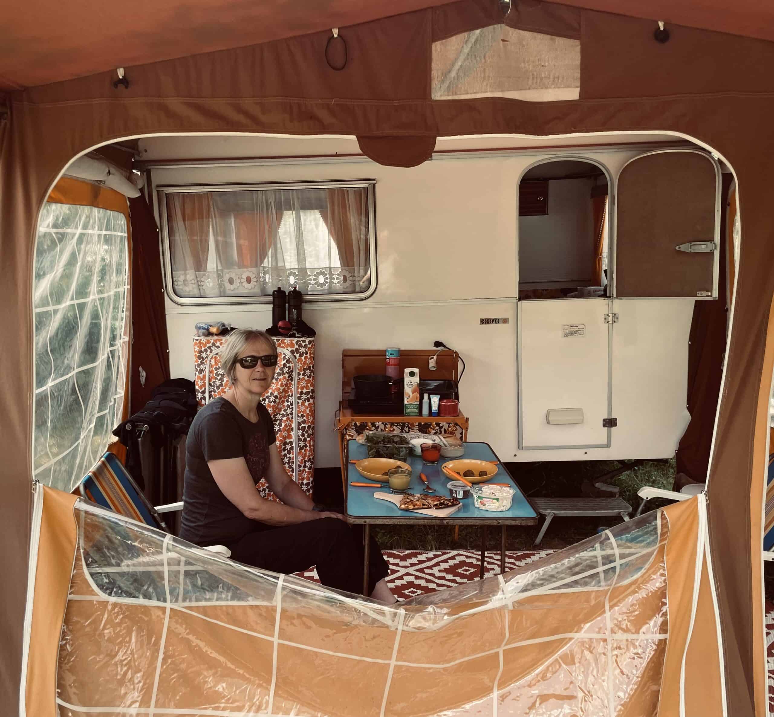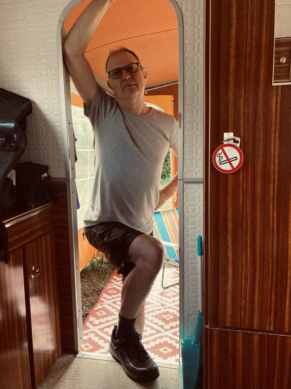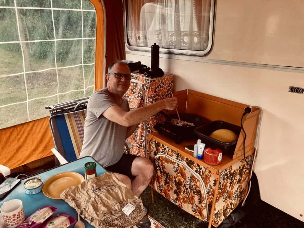 Lazed about for most of the afternoon and made a concerted effort to do absolutely nothing. I accidentally did something constructive and shaved three weeks worth of greying fuzz off my face – goodbye Vic Reeves lookalike, here’s Jonny! Jackie photographed me posing in the doorway – I’m hoping it will be chosen as Mr September for the Caravan Club 2024 calendar. Stretched out in the shade on dangerous 70s folding loungers for a while until using up more of the 800 tonnes to cook a delicious rice/tomato/veg/tuna one-pot dinner on the only nod to modern life, a single induction hob. To power up the hob we had to plug it into an extension lead socket that had been left dangling in the washing up bowl. A health and safety nightmare!
