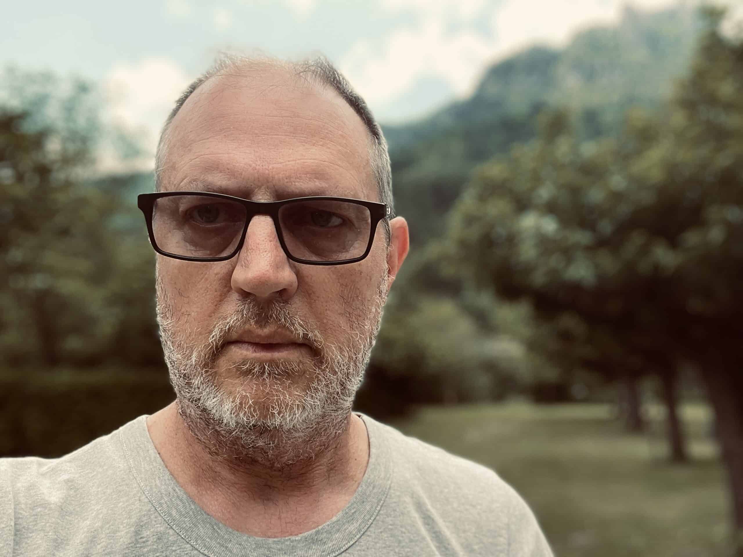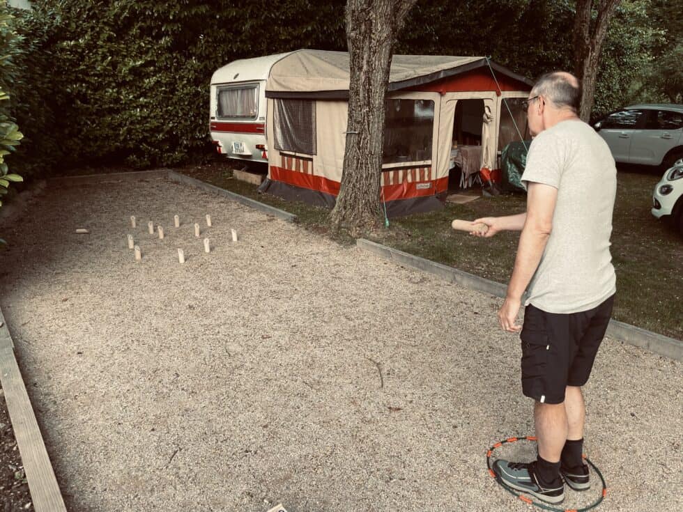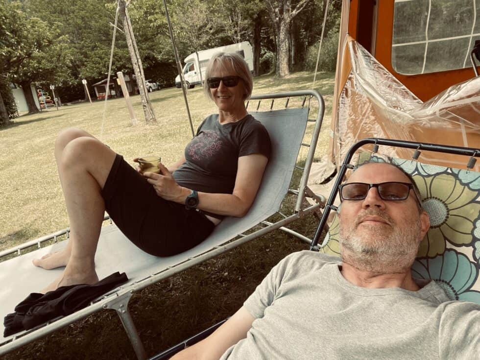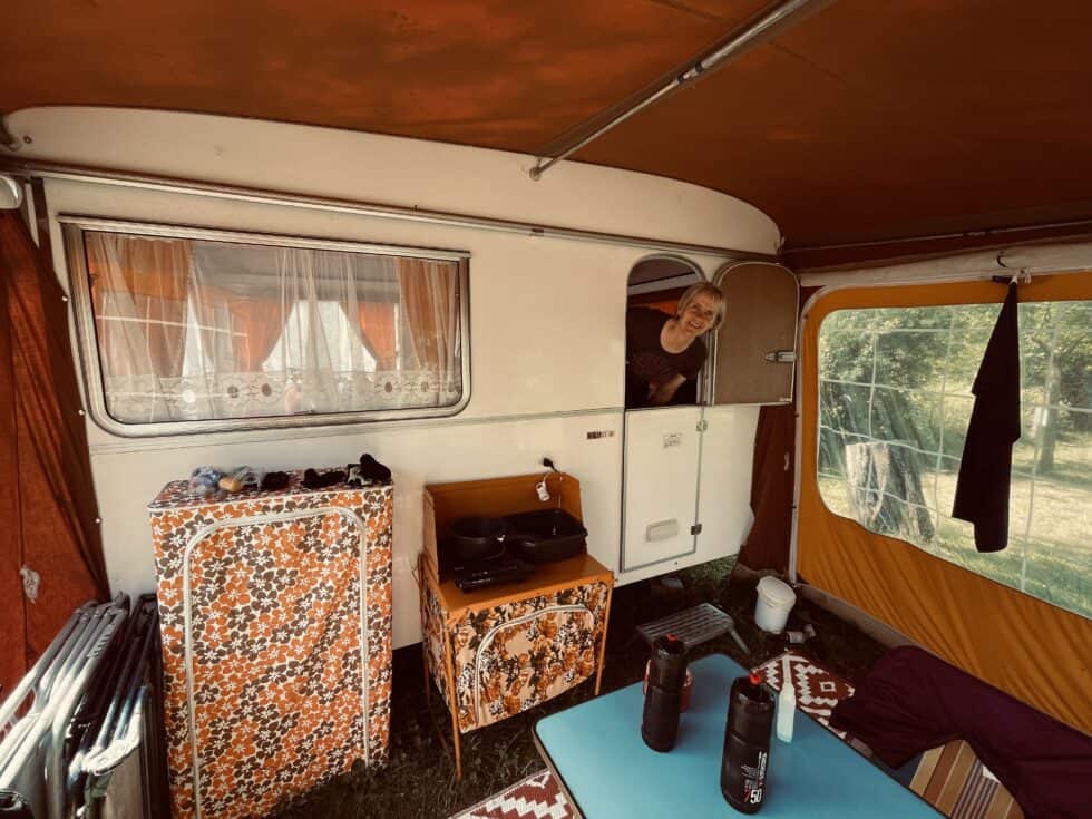 Lazed about for most of the afternoon and made a concerted effort to do absolutely nothing. I accidentally did something constructive and shaved three weeks worth of greying fuzz off my face – goodbye Vic Reeves lookalike, here’s Jonny! Jackie photographed me posing in the doorway – I’m hoping it will be chosen as Mr September for the Caravan Club 2024 calendar. Stretched out in the shade on dangerous 70s folding loungers for a while until using up more of the 800 tonnes to cook a delicious rice/tomato/veg/tuna one-pot dinner on the only nod to modern life, a single induction hob. To power up the hob we had to plug it into an extension lead socket that had been left dangling in the washing up bowl. A health and safety nightmare!