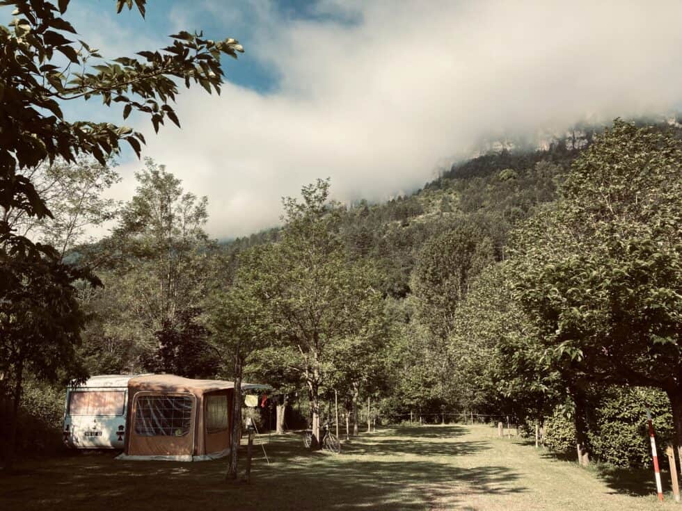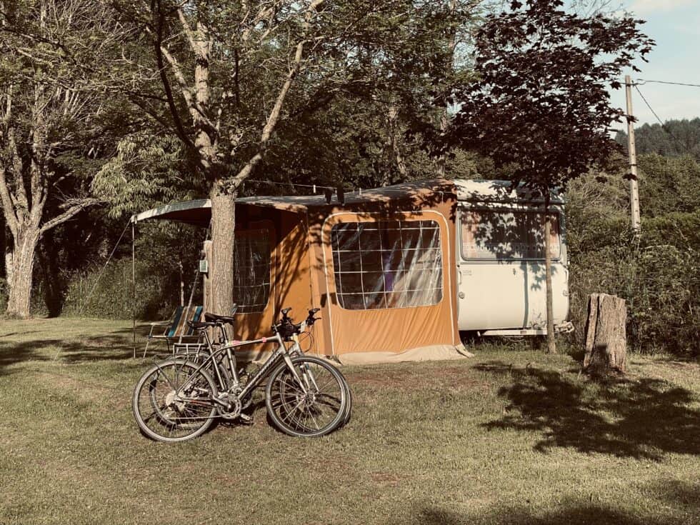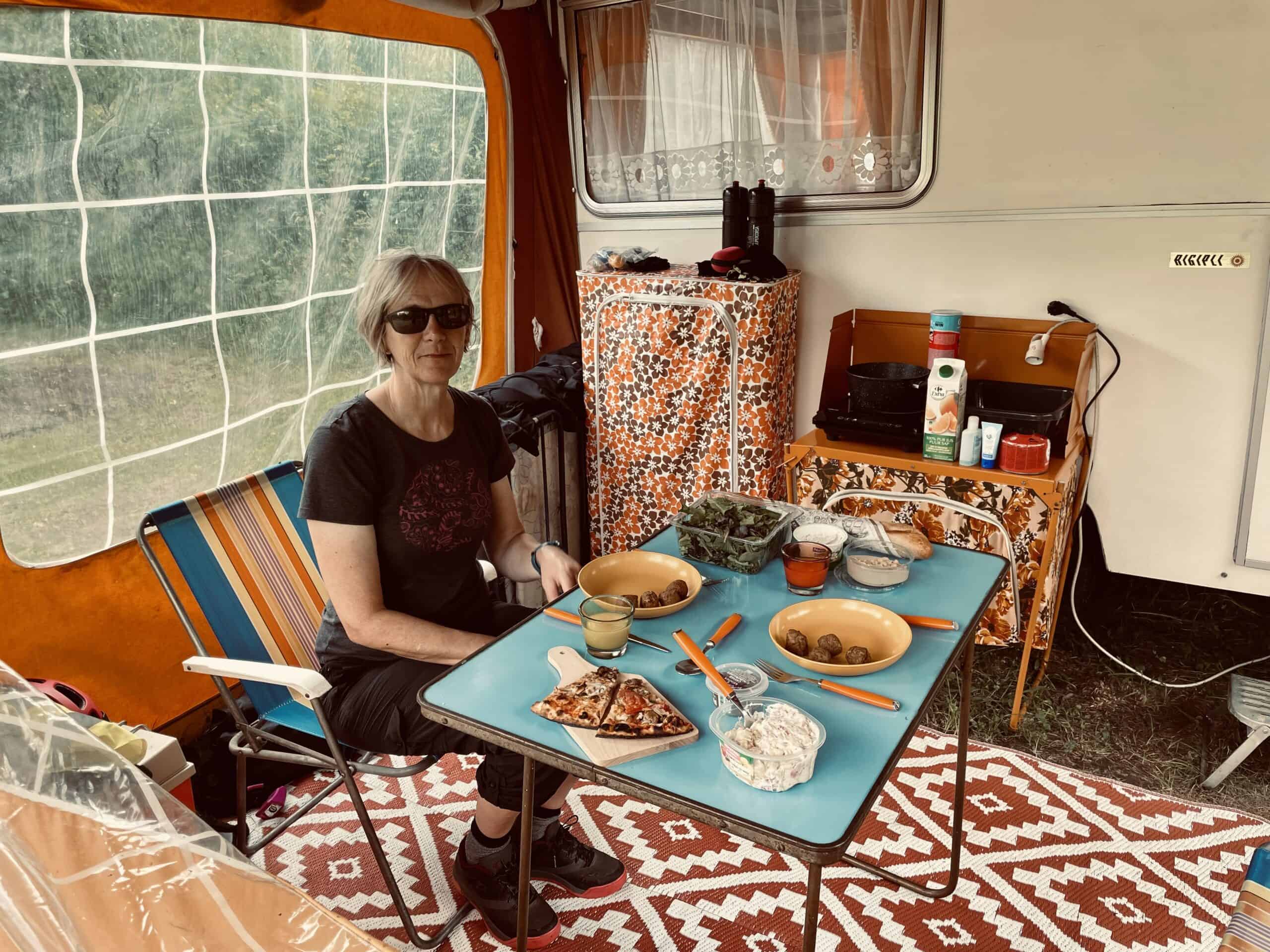 Cycled back to the campsite and put maximum effort into lazing round in our brown and orange domain. The torrential rain that was forecast didn’t materialise, just a light shower here and there. The 800 tonnes of food yielded a fantastic lunch of salad piemontaise, hoummus, fresh bread, green leaves, aubergine caviar (super delicious but unwarranted pretentious name!), cheese, falafels. Laid out a lovely spread in the awning making good use of the period crockery and cutlery.